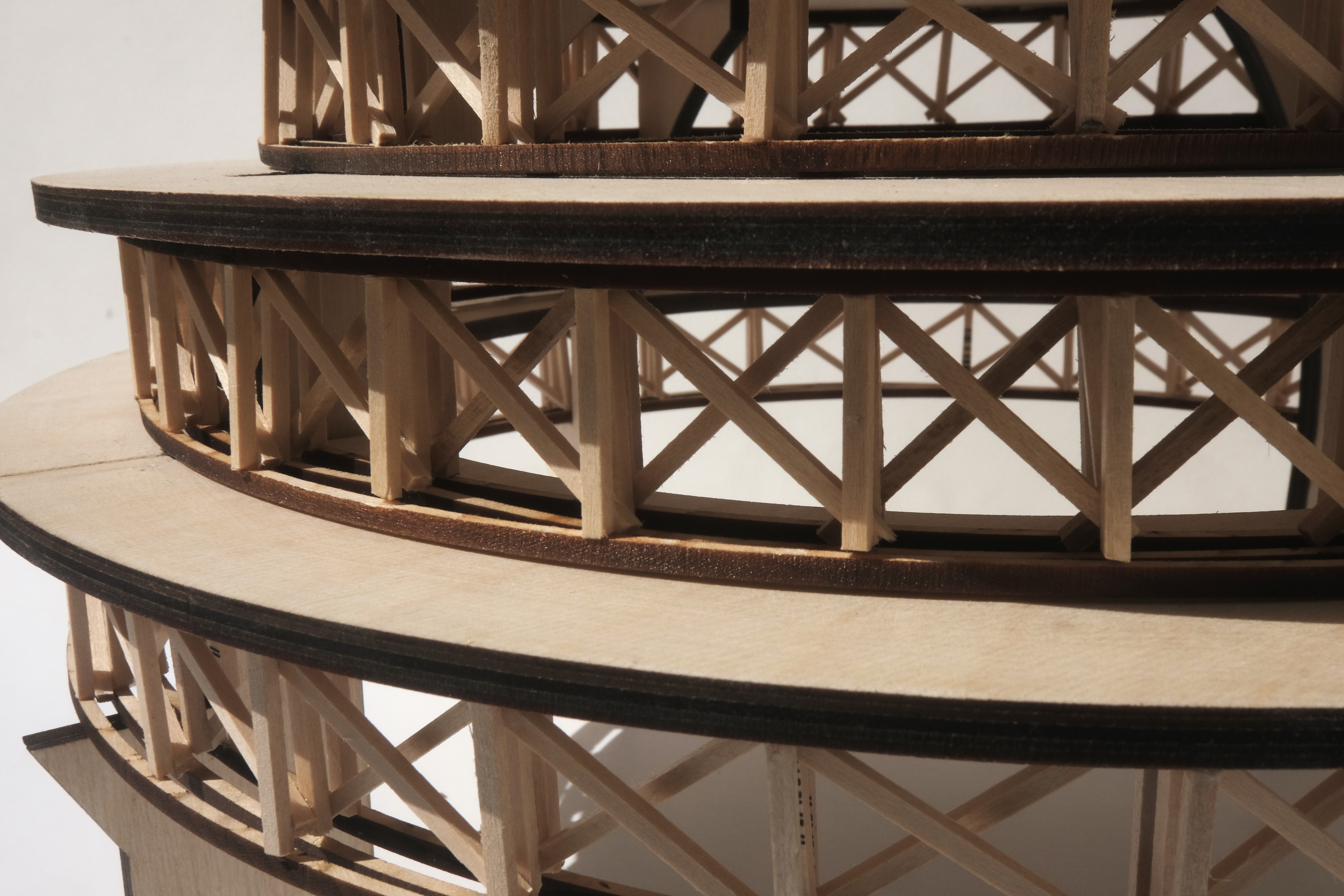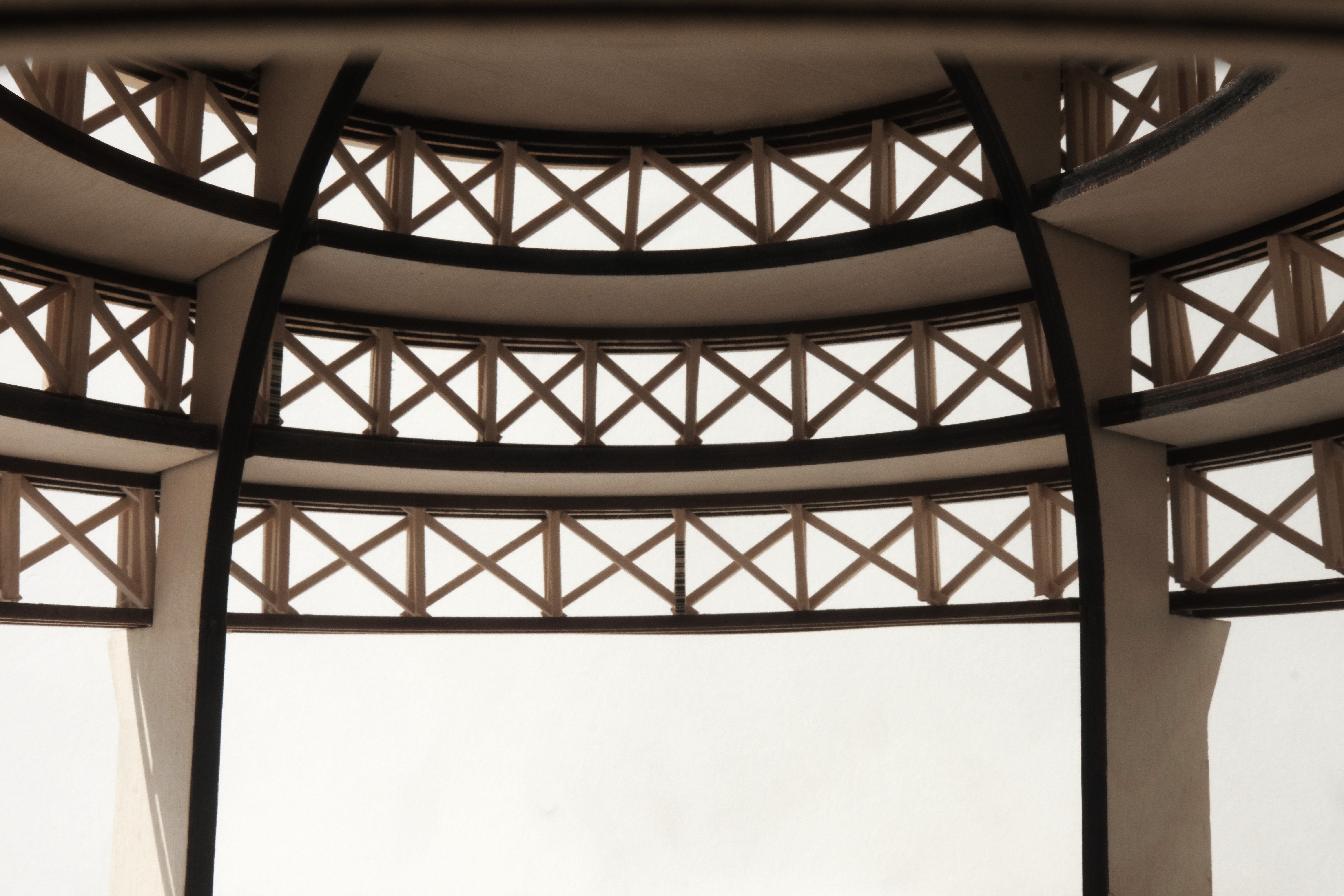 The goal was to research truss systems, leading to the development of a triple-layered truss adapted for stacked circular roof plates. The ring-shaped trusses with diagonal members formed a cross-hatched structural system. As sunlight moves throughout the day, the layers of structure cast dynamic shadows onto the ground.