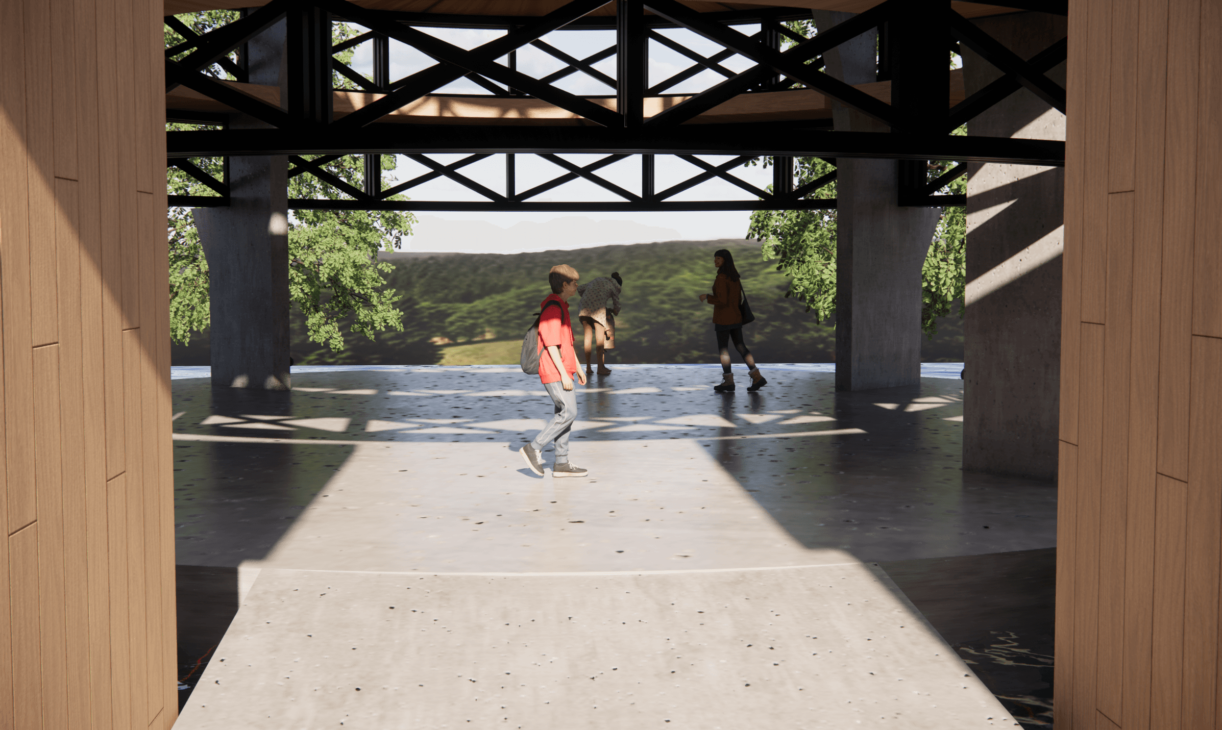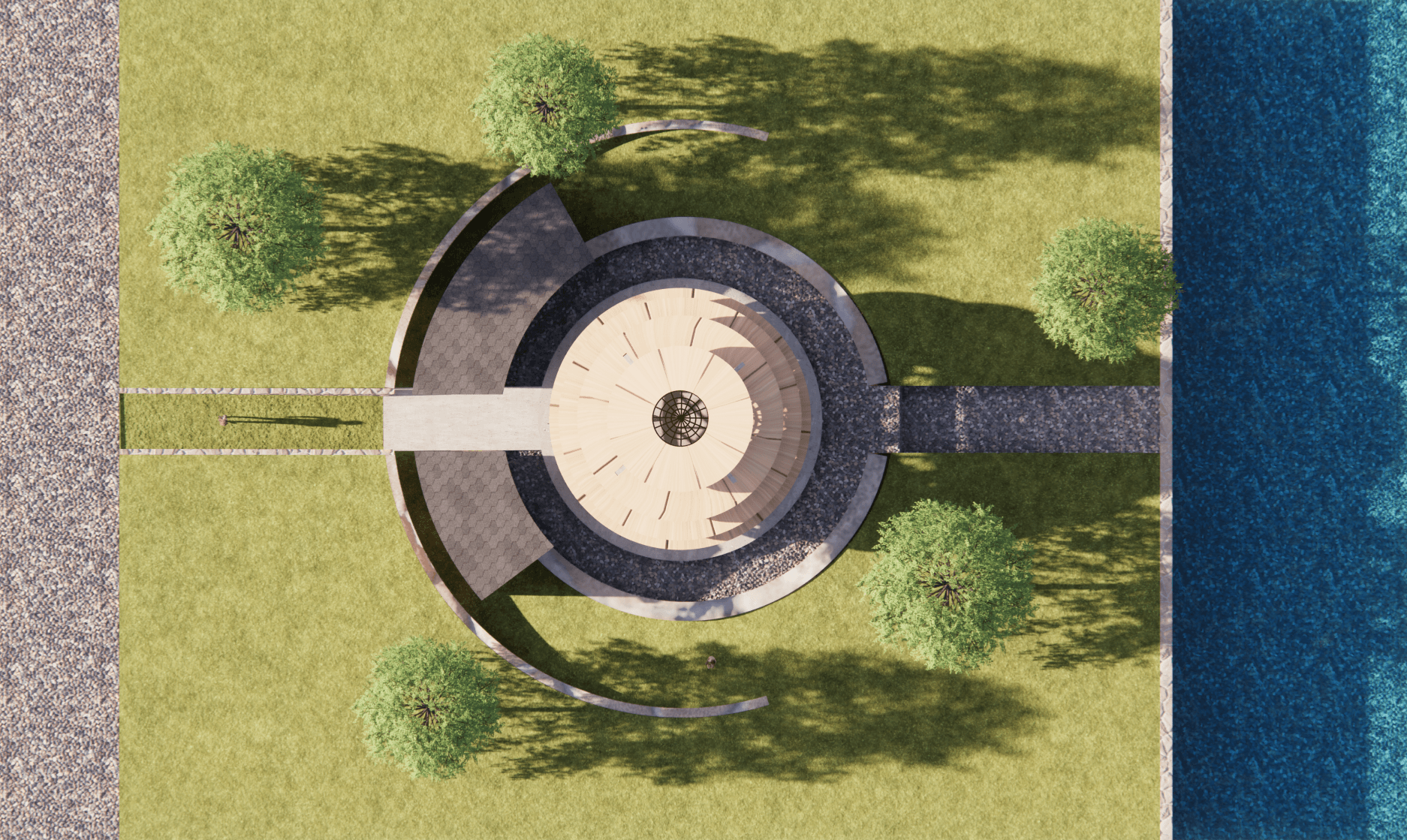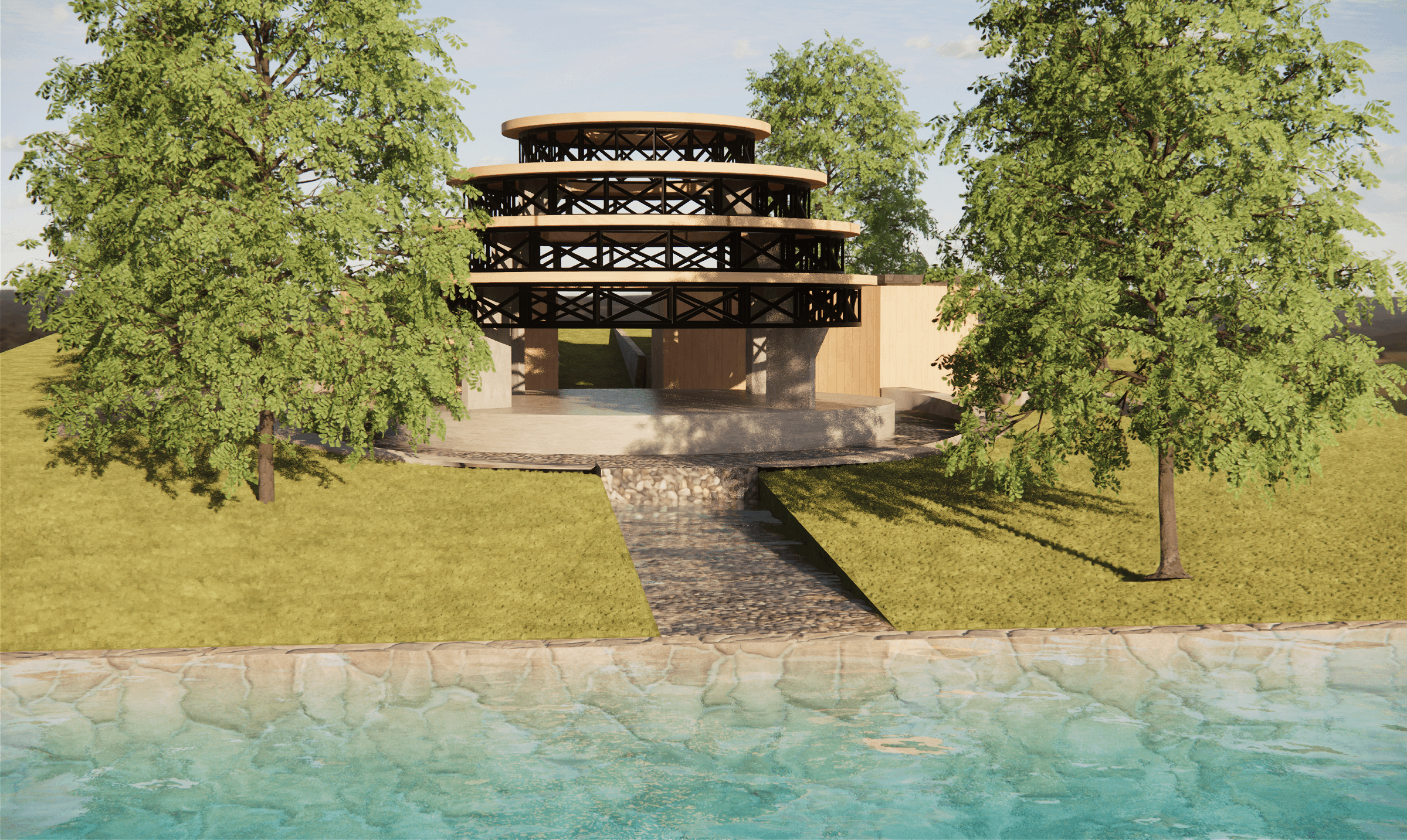 This project explores the integration of structure and landscape. As the terrain slopes toward the river, the pavilion emerges from the sunken landscape as a central focal point. The surrounding land forms a natural ramp, guiding circulation around the structure. In this way, the landscape becomes an active part of the experience when engaging with the pavilion.